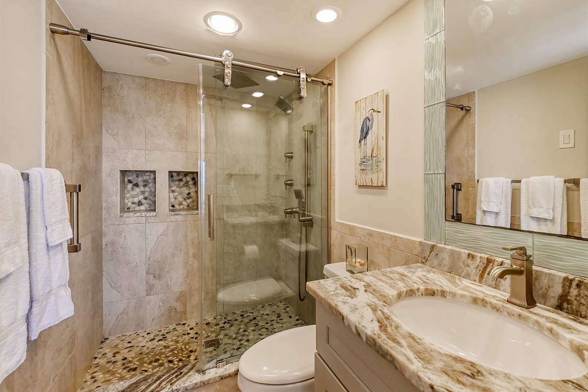 2 Bedrooms • 2 Bathrooms 2 Baths • Sleeps 4-6A millionaire's retreat! This completely remodeled first floor unit with view of the Gulf of Mexico and amazing sunsets awaits you on Siesta Key. Walk out the lanai door directly to the beach where children can play within view or walk over the boardwalk to the blue-green waters of the Gulf within 100 feet of your door. This unit features coastal designed furniture including new mattresses for the king master and guest room with both a queen and a twin bed. There is also a portable twin bed for an extra guest. The driftwood tiled floors and 55" television in the living room add to the leisurely ambience. B106 includes a full-size washer and dryer, high speed internet, and HD TV channels. The baths are beautiful and unique with multiple shower heads to enjoy after a swim in the Gulf.